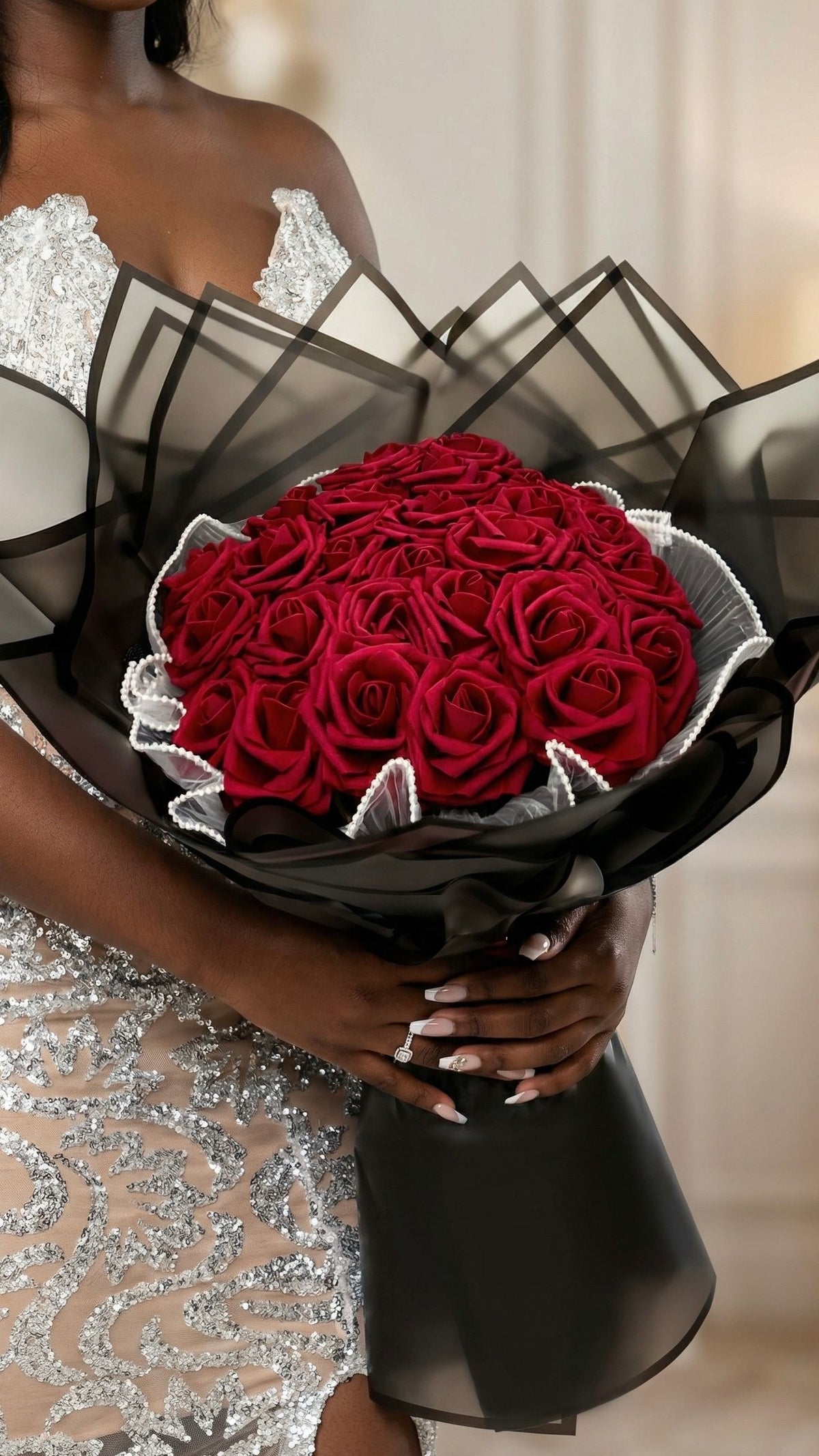 Unser Bouquet ‚Noir‘ verbindet tiefrote Rosen mit einer luxuriösen schwarzen Verpackung – ein stilvolles Geschenk für Liebe und besondere Momente.